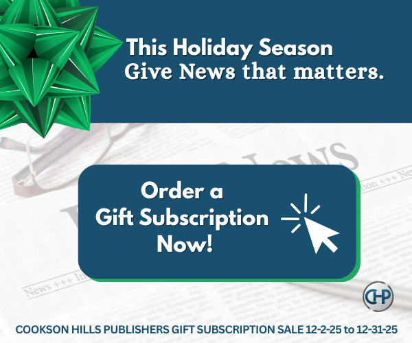 Stay connected to your community with trusted local news from Cookson Hills Publishers. Gift Subscription Sale Price is available December 1-December 31st. Current subscribers get 3 Free Months added to their subscription when they give a Gift Subscription!