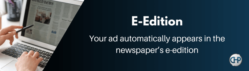 Every print ad includes a free placement in our e-edition—giving your business added visibility at no extra cost. The e-edition is an interactive digital version of the newspaper, reaching readers who prefer to stay connected online. This added exposure ensures your message is seen by a wider audience, maximizing the impact of your advertising investment.
